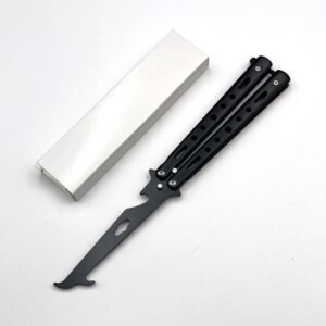 Total length: 251mm (9.88)Inch Blade length: 110mm (4.33)Inch Handle: 141mm (5.55)Inch Blade thickness: 3mm (0.118)Inch Blade width: 18mm (0.7)Inch Handle thickness: 13mm (0.51)Inch Hardness: 56-58HRC Blade material: 440 Handle material: Aviation aluminum 7075 Net weight: 106gV4 Butterfly 6061 Aluminum Bright Slot Training Balisong Knife