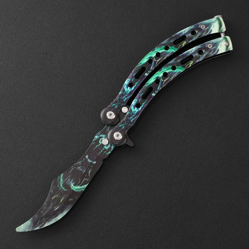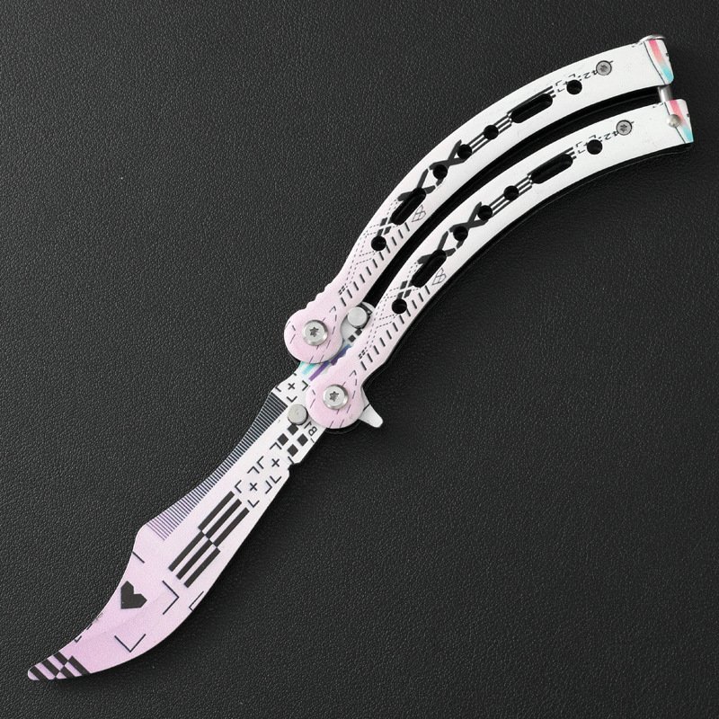 Perfect your flipping moves in style with our CSGO Butterfly Knife Trainer or use for martial arts performances. Either way, you??ll look great using this colorful trainer. It has a 4 1/4?? stainless steel trainer blade with a photography quality impeccable design. The handles are of stainless steel with resin inserts to match the blade. The colorful butterfly trainer is 9 1/2?? in overall length, 6?? when closed and it has a secure handle locking mechanism.