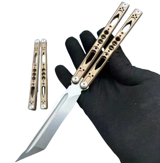Total length: 255mm (10 inches) Blade length: 110mm (4.33 inches) Handle: 145mm (5.70 inches) Blade thickness: 3mm (0.118 inches) Blade width: 26.8mm (1.05 inches) Handle thickness: 12.6mm (0.49 inches) Hardness: 56-58HRC Blade material: 440 Handle material: Integrated aviation aluminum 6061-T6 System: Bushing Net weight: 110gREP integrated aluminum handle uncut practice butterfly training